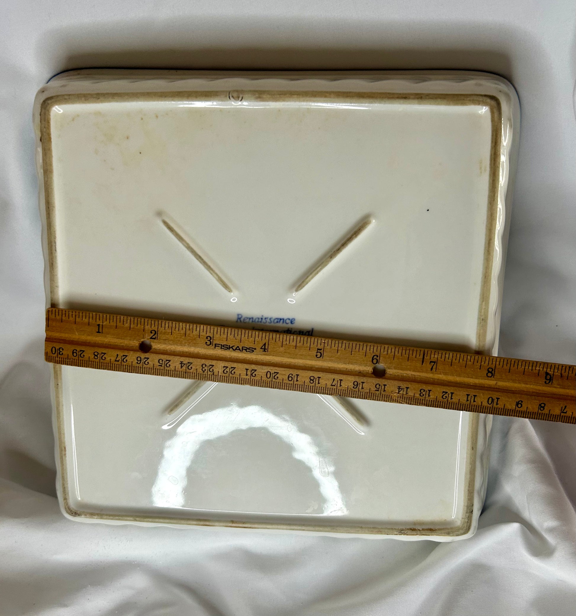 Classic square ceramic baking dish featuring a crisp white finish with charming blue trim. Perfect for casseroles, baked dishes, and farmhouse-style serving. A timeless piece that combines functionality with rustic elegance.